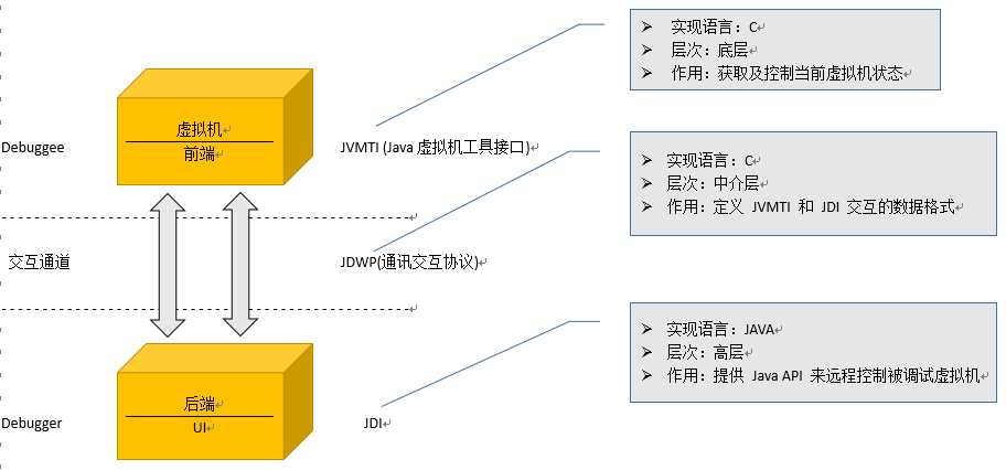 这三个层次由低到高分别是 Java 虚拟机工具接口(JVMTI),Java 调试线协议(JDWP)以及 Java 调试接口(JDI)。可以分别比喻为调试者(debugger)和被调试者(debuggee),以及他们中间的通信器。