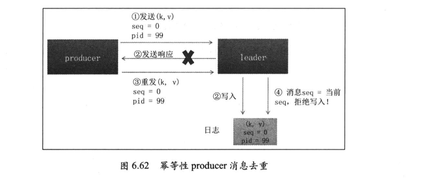 **0.11.0.0版本引入的幂等性producer表示它的发送操作是幂等的。**瞬时的发送错误可能导致producer端出现重试,同一条消息被 producer发送多次,但在 broker端这条消息只会被写入日志一次。对于单个 topic分区而言,这种 producer提供的幂等性消除了各种错误导致的重复消息。