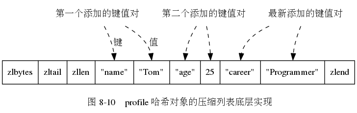 压缩列表作为哈希对象的底层实现,每当有新的键值对要加入到哈希对象时,程序会将键压入压缩列表表尾,再将值压入压缩列表的表尾。