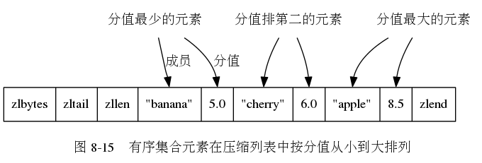 ziplist编码的有序集合对象使用压缩列表作为底层实现,每个集合元素使用两个紧挨在一起的压缩列表节点来保存,第一个保存元素成员,第二个保存元素的分值,压缩列表内的集合元素按分值从小到大进行排序,分值较小的元素被放置在靠近表头的位置。