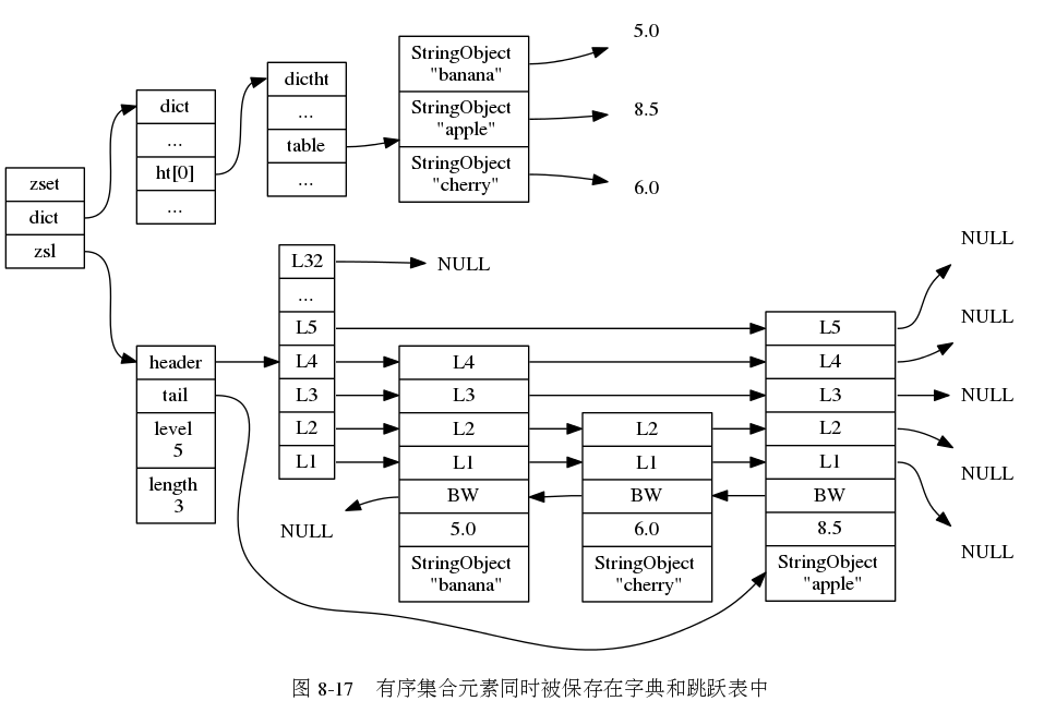 skiplist编码的有序集合对象使用zset结构作为底层实现,一个zset同时包含一个字典和一个跳跃表。