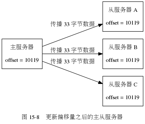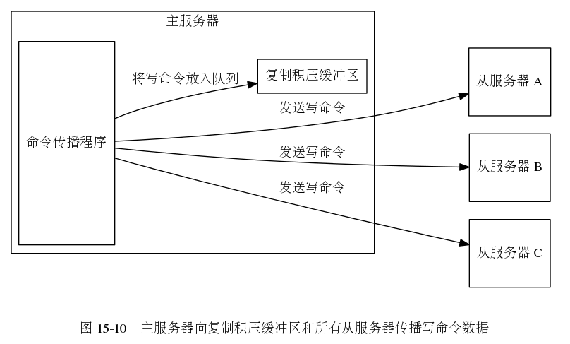 - 主服务器将记录在缓冲区里面的所有写命令发送给从服务器
