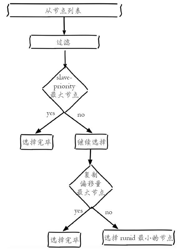 5. 如果复制偏移量不可用或者从服务器的复制偏移量相同, 那么带有最小运行 ID 的那个从服务器成为新的主服务器。