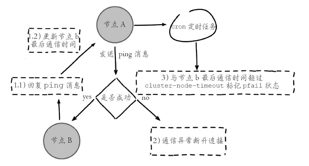集群中每个节点都会定期向其他节点发送ping消息,接收节点回复pong 消息作为响应。如果在cluster-node-timeout时间内通信一直失败,则发送节点会认为接收节点存在故障,把接收节点标记为主观下线(pfail)状态。