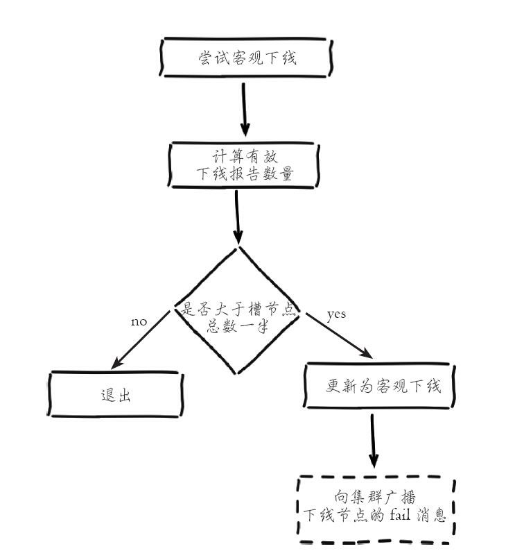 - 通知集群内所有的节点标记故障节点为客观下线状态并立刻生效。