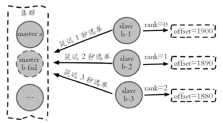 主节点b进入客观下线后,它的三个从节点根据自身复制偏移量设置延 迟选举时间,如复制偏移量最大的节点slave b-1延迟1秒执行,保证复制延 迟低的从节点优先发起选举。