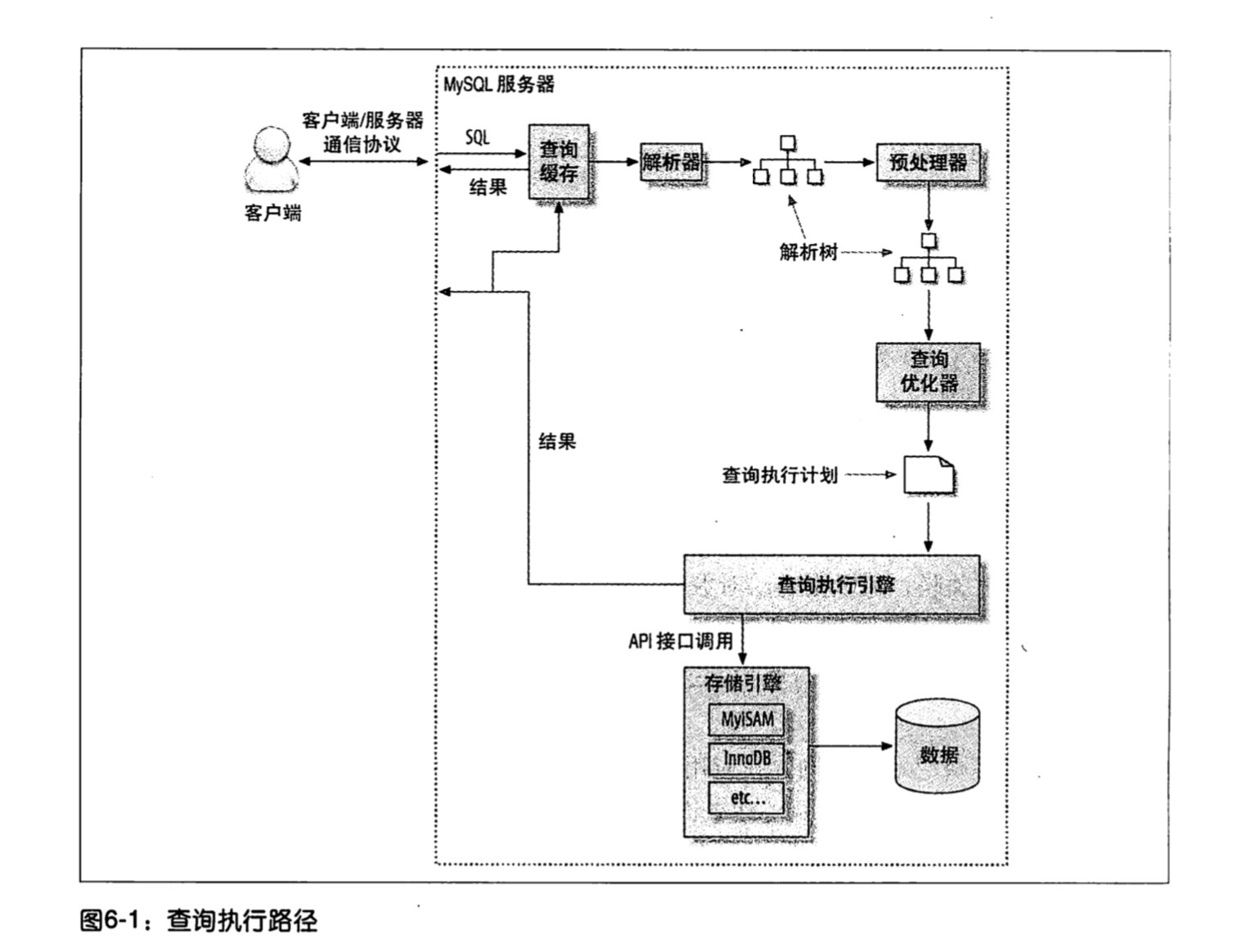 MySQL生成査询的一棵指令树,然后通过存储引擎执行完成这棵指令树并返回结果。