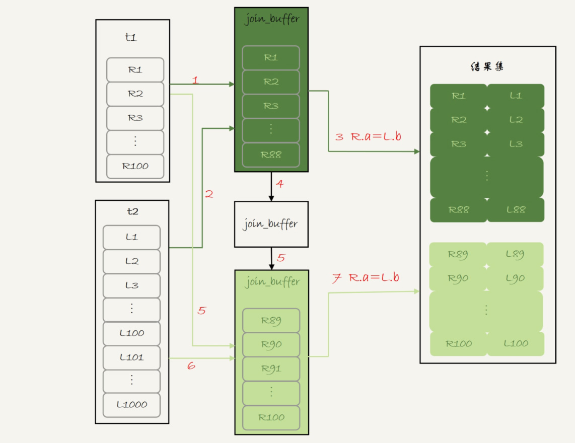这时候由于表t1被分成了两次放入join_buffer中,导致表t2会被扫描两次。虽然分成两次放入join_buffer,但是判断等值条件的次数还是不变的,依然是(88+12)*1000=10万次。