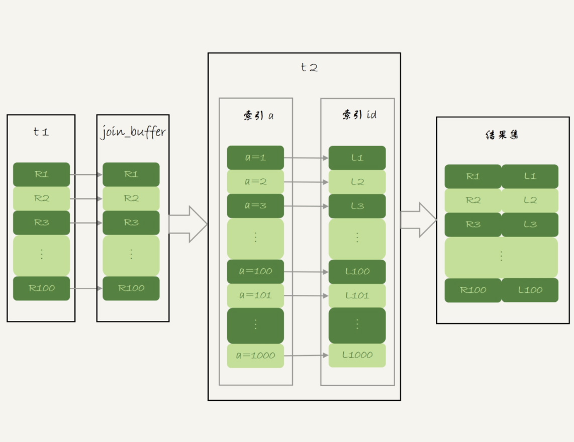 把表t1的数据取出来一部分,先放到一个临时内存。这个临时内存不是别人,就是join_buffer,一次性传给t2,t2可以匹配的时候可以根据索引顺序读。
