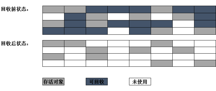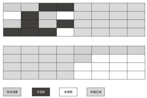 算法简介:让所有存活的对象都向一端移动,然后直接清理掉端边界以外的内存。