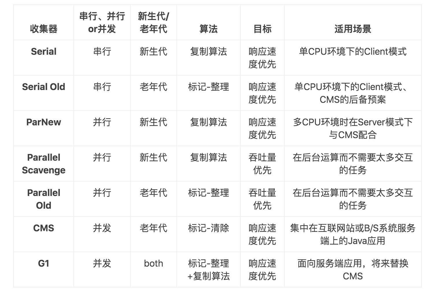 优点:在单核CPU下,Serial收集器没有线程交互的开销,比其他收集器更高效。