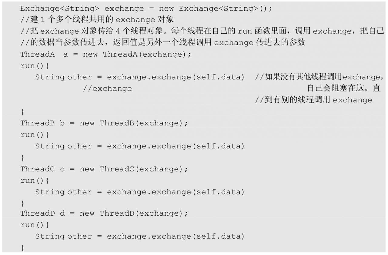Exchanger Exchanger用于线程之间交换数据,其使用代码很简单,是一个exchange(..)函数,