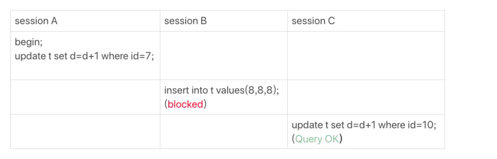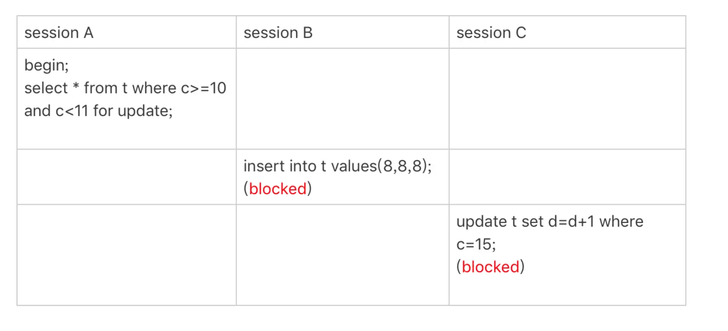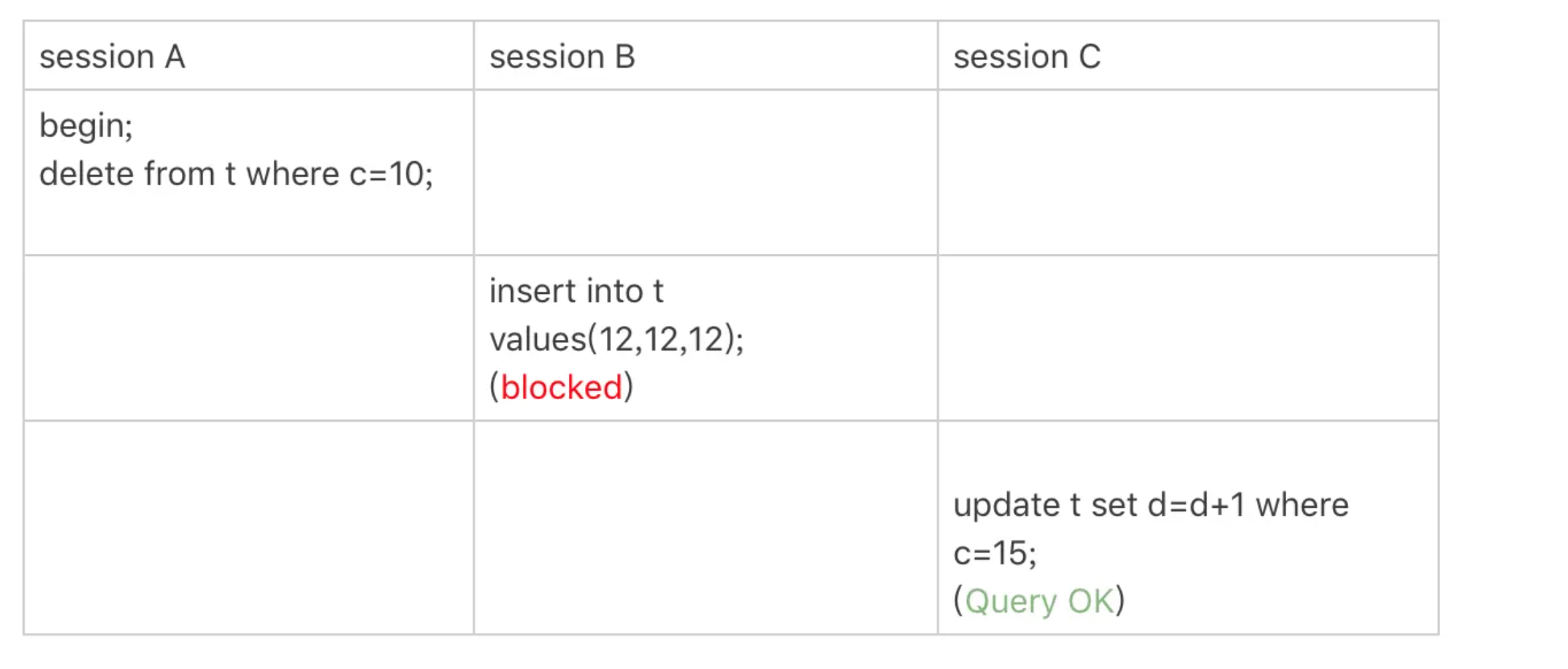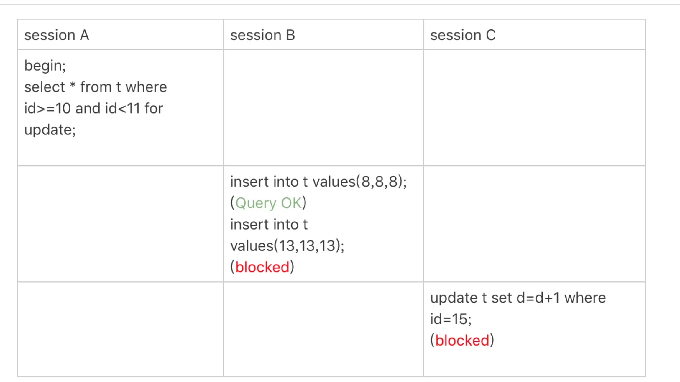 - 至此session A 共获取了 (0,5],(5,10)两个间隙锁。