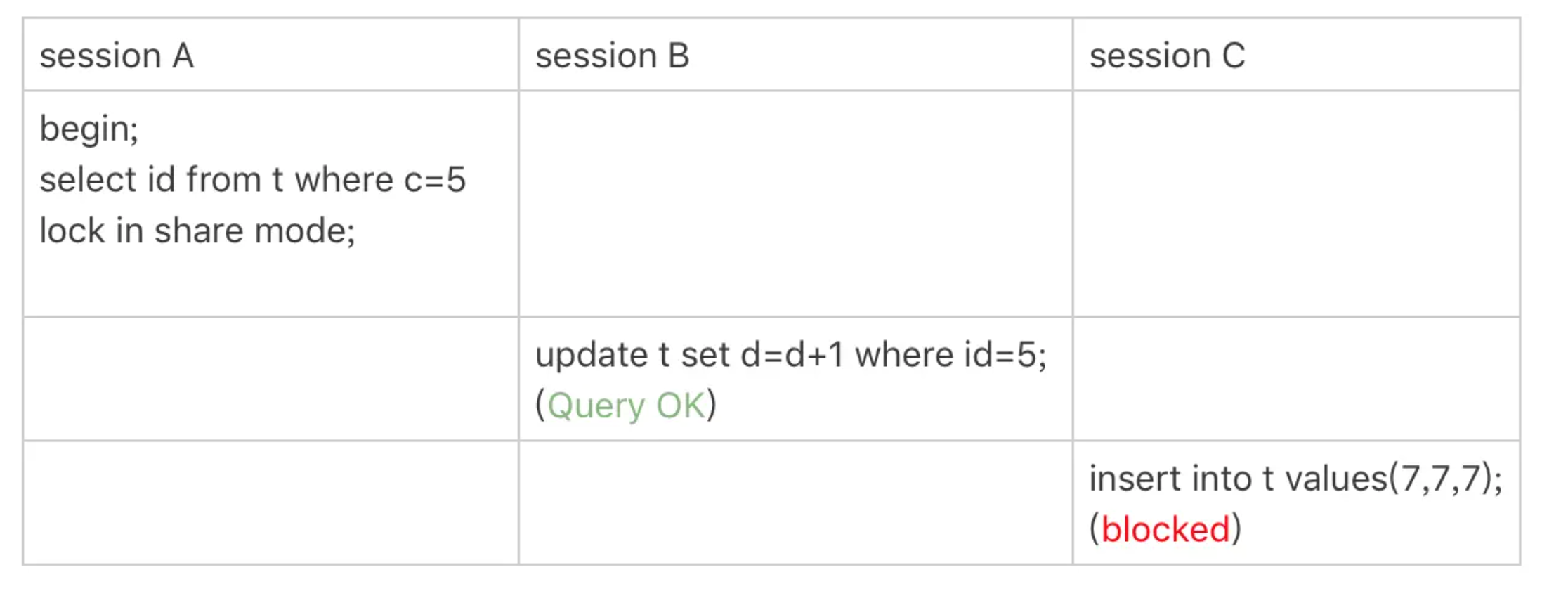 - session C要插入一个(7,7,7)的记录,就会被session A的间隙锁(5,10)锁住。