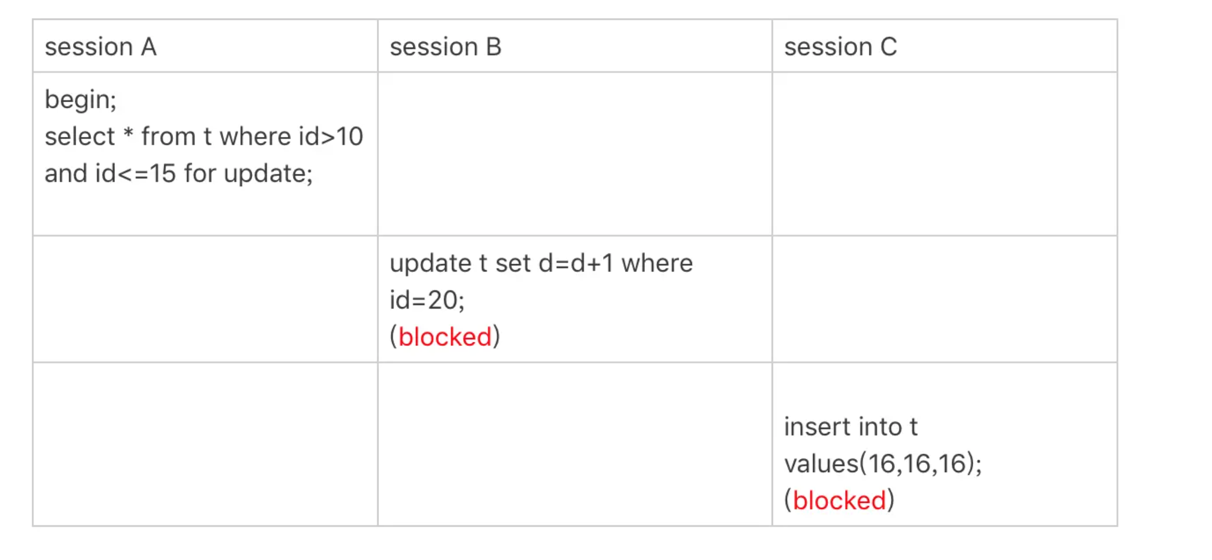 session A是一个范围查询,按照原则1的话,应该是索引id上只加(10,15]这个next-key lock,并且因为id是唯一键,所以循环判断到id=15这一行就应该停止了。