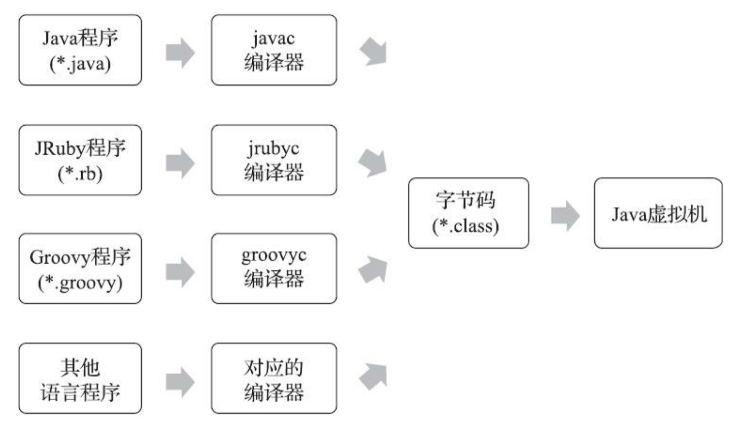 在Java技术发展之初,设计者们就曾经考虑过并实现了让其他语言运行在Java虚拟机之上的可能性,他们在发布规范文档的时候,也刻意把Java的规范拆分成了《Java语言规范》(The Java Language Specification)及《Java虚拟机规范》 (The Java Virtual Machine Specification)两部分。